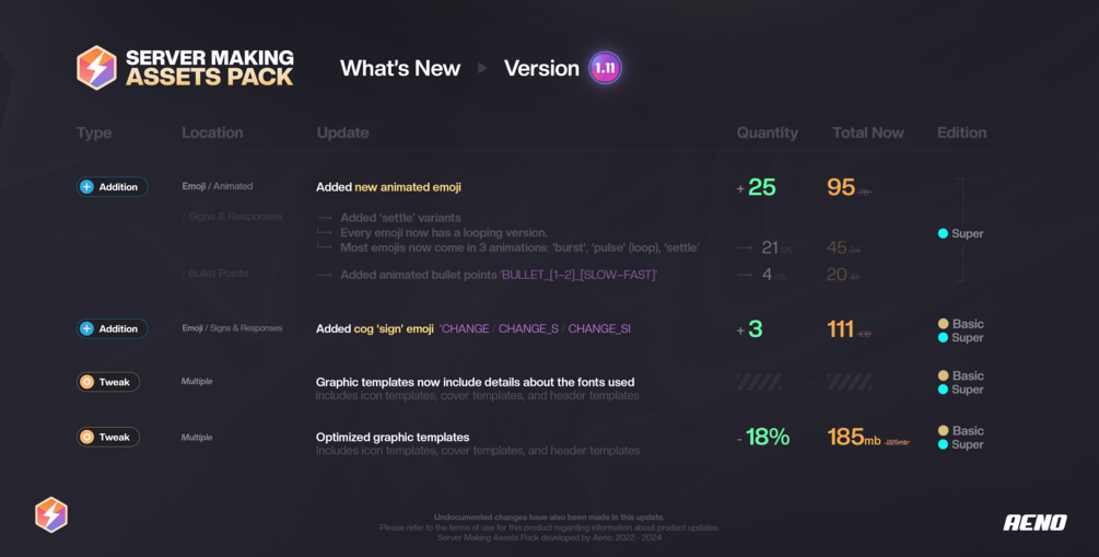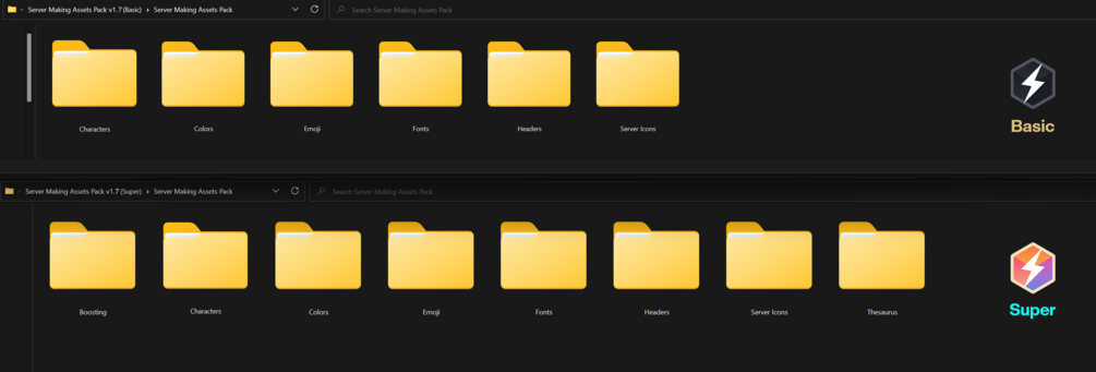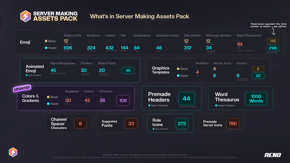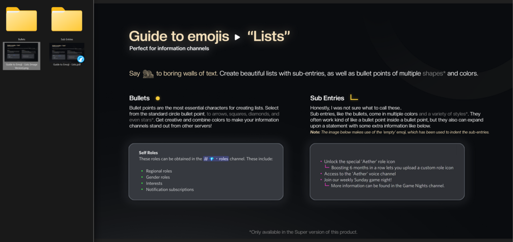 - The paid edition, titled 'Super', also includes assets for those who want to make their server the best it can be, such as a multitude of role icons, the thesaurus, and an impressive collection of bullet points and sub-entries available in multiple shapes and colors.